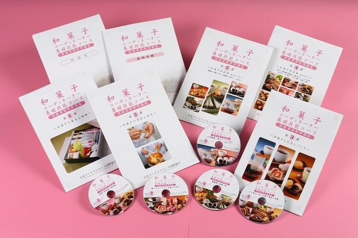 DVD5枚(13種類の和菓子実技編)、テキスト5冊、添削用紙1冊、問題用紙1冊